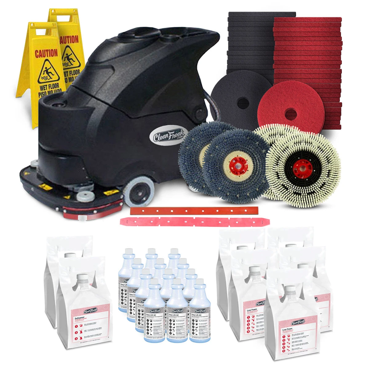With this package, you get everything you could possible need to clean or strip an industrially rated floor. The CleanFreak 24″ floor scrubber comes with a 19 gallon solution tank to clean extremely large areas. Different pads, brushes, degreasers and stripping solutions are included to accommodate you depending on the severity of the cleaning job you have in front of you. Additional squeegees and a defoamer are included to keep the scrubber running when you need it most. 2 additional wet floor signs are included to signal other people in the area to steer clear of the area you are cleaning.