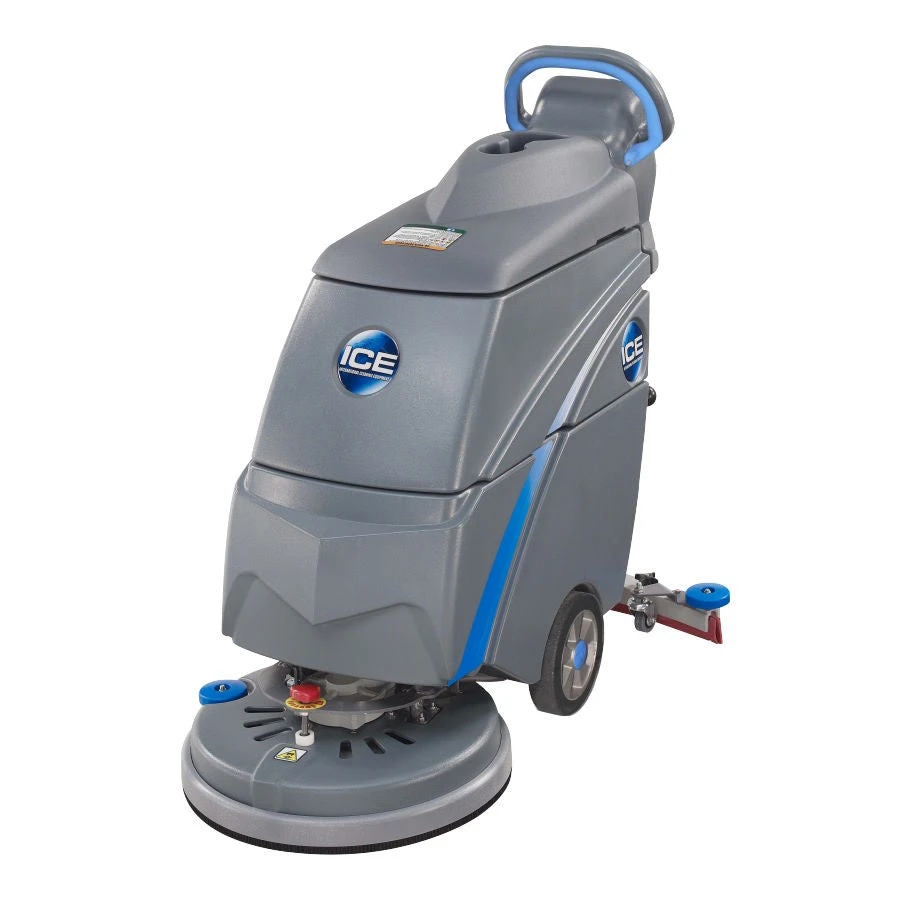 The ICE i18C auto scrubber is a self-propelled, easy-to-operate cord-electric floor scrubber. It is perfect for small to medium sized facilities because of its compact size. An 82′ power cord provides an extended reach and unlimited cleaning time. There are no belts to wear out or adjust because the i18C is built with a gear-driven brush motor.