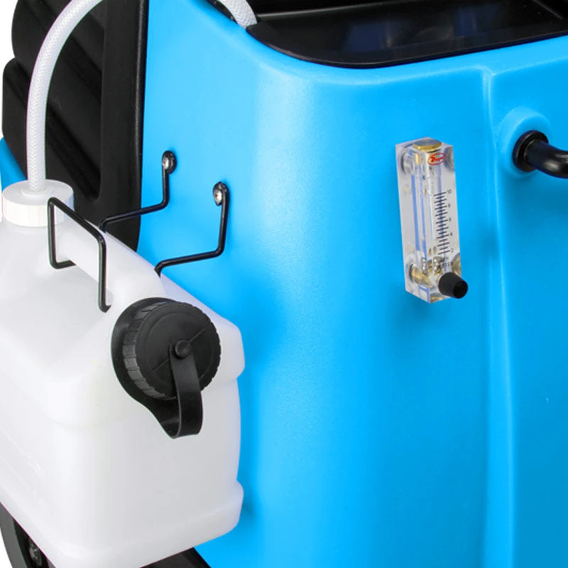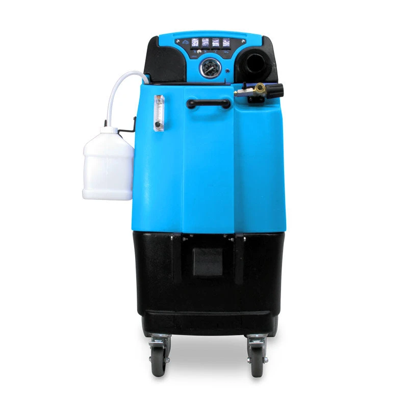 One of the greatest features of this machine is how easy it is to use. There are a total of 4 summarys on the control panel, and then a dial next to the solution line for increasing and decreasing the water pressure. The 4 summarys are used to turn on vac motor #1, vac motor #2, the delivery pump, and the pump-out feature. To utilize the auto-fill and pump-out features for continuous usage on this machine, just connect a standard garden hose from a water source tothe auto-fill connection. Turn on the water source and let the tank begin to fill. It will shut off when the water level reaches the float switch in the solution tank.