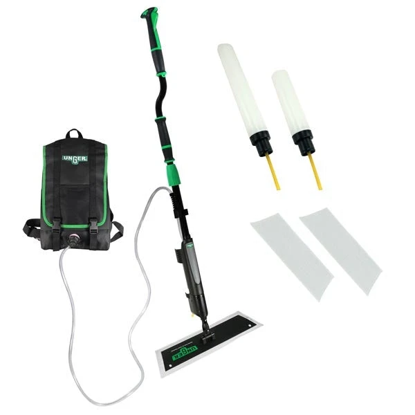 This unit comes with a range of options for distributing your liquid to the floor. This kit comes with two bottles (0.5 liter bottle and 1 liter bottle) that mount right on the pole. The kit also includes a backpack for holding up to 5 liters, which allows you to cover more floor between refills while removing the weight the pole to make it lighter and more maneuverable. Be sure to clean out your tanks and bladders between each use to avoid clumps or blockage with the help of our maintenance guide.