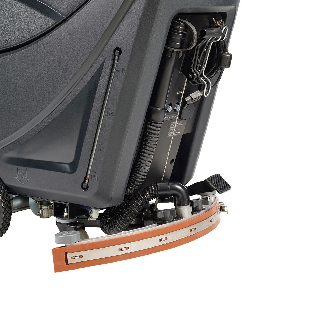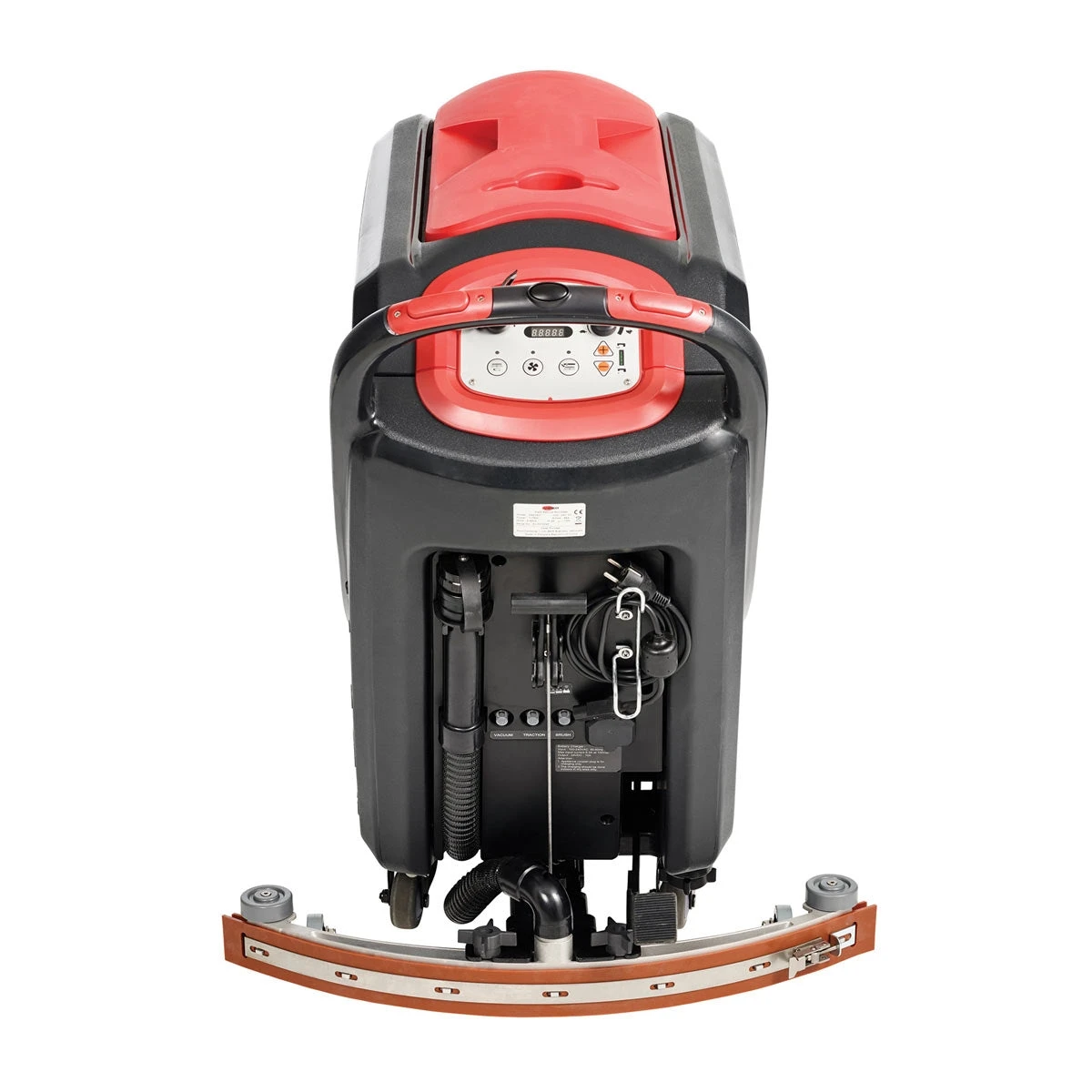 The machine is operated with a simple-to-use control panel that makes learning and operating the scrubber an easy task. Hour meter, battery capacity, brush on/off, vacuum on/off, traction drive, and water dispensing are all clearly displayed for maximum efficiency. A follow-behind squeegee system leaves floors bone dry after scrubbing. An easy dirty tank dump hose and clean tank dump valve are recommended to be dumped and cleaned out after each and every use.